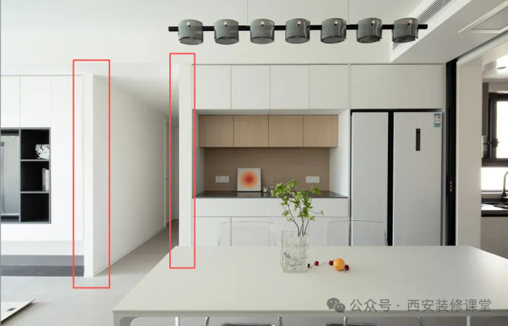 木工新砌墙隔墙,实现镶嵌,即使餐边柜造型复杂,侧面也不会露出,没有色差也没有了缝隙问题。
