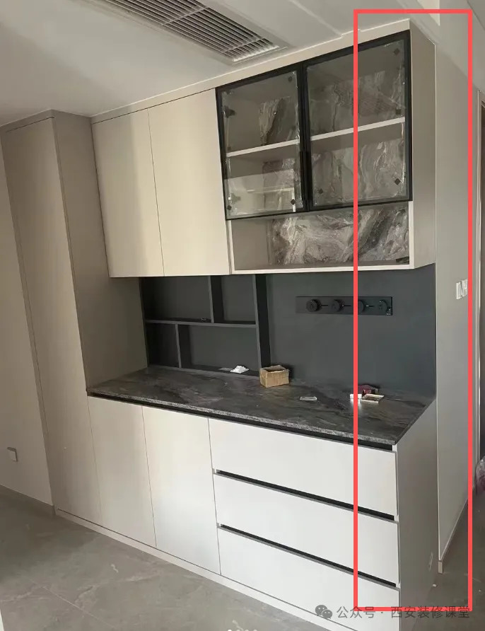 如图所示,一旦前期没有注意,就会造成餐边柜侧面板子颜色与墙体不一致,有了视觉色差。
