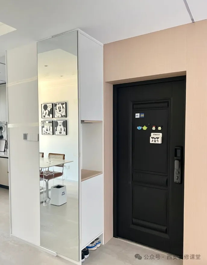新砌石膏板隔墙,后期鞋柜嵌入式安装,完美解决了色差以及后期柜体与墙体的缝隙问题。