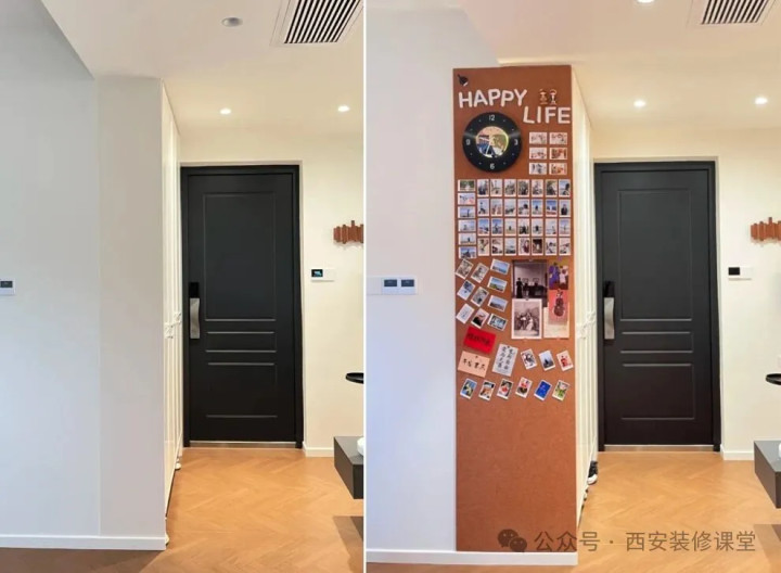 网购毛毡或者软木板贴上就可以满足一个照片墙的功能,同时掩盖了原有色差和缝隙问题。