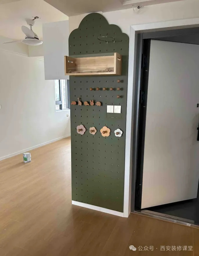 例如采用后期定制洞洞板的形式,遮盖颜色不一样以及缝隙,而且还延伸出来其他收纳功能