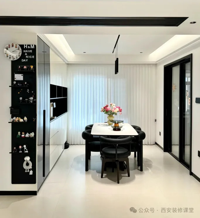 刚好家里是黑白风格,采用黑色洞洞板遮挡,延伸功能,同时解决了餐边柜与墙体色差和缝隙问题。