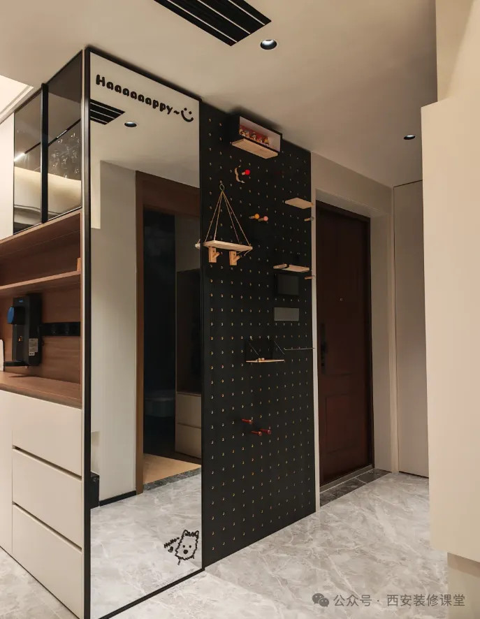 一个全身镜与洞洞板组合,解决餐边柜侧面与墙体颜色不一致的问题,也解决了缝隙问题。