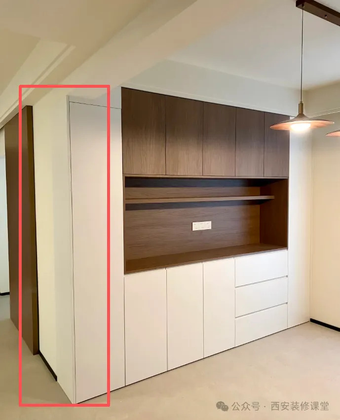 需要装修前规划,担心定制柜侧面与旁边墙体缝隙以及颜色不一致,可以在木工的时候采用石膏板隔墙,定制柜嵌入式安装,完美解决色差以及缝隙问题。而且还可以弱化柜体的厚重感。