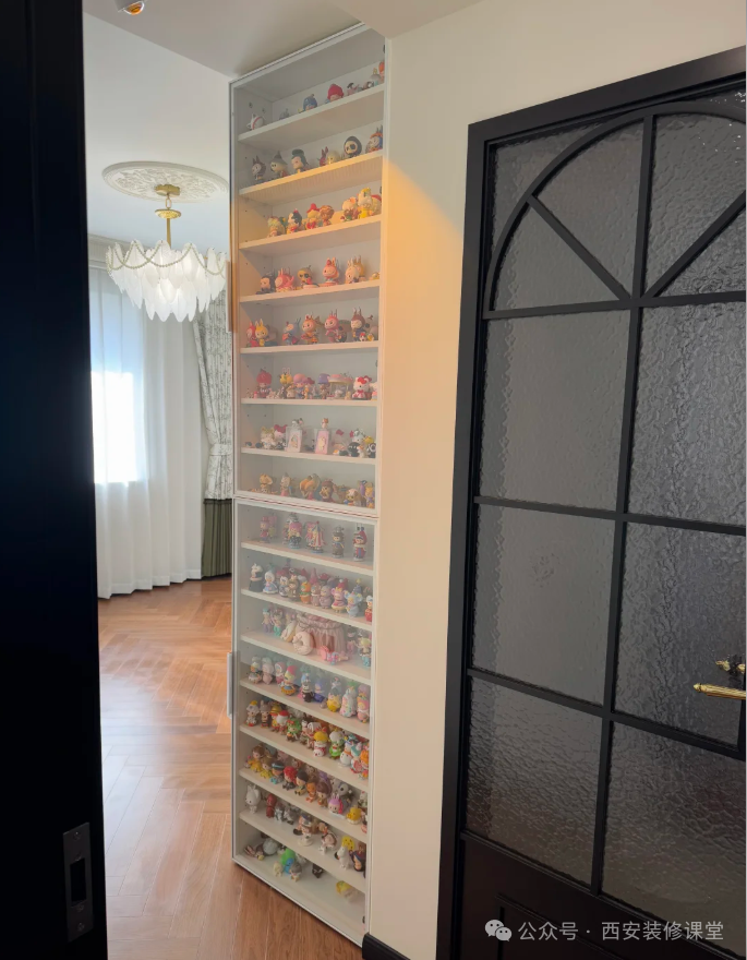 如果衣柜侧面无法与墙面颜色统一,采用侧面镂空手办展示架的形式,跳出颜色,延伸不同功能,也解决了侧板与墙面颜色不统一的问题了。